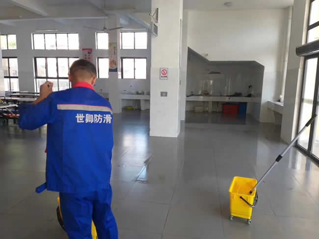 海島空氣潮濕,極意產(chǎn)生地面濕滑問題,學(xué)校領(lǐng)導(dǎo)和教育局領(lǐng)導(dǎo)都很重視學(xué)校安全問題。舟山世卿防滑于2019年7月23日開始為【嵊泗縣初級中學(xué)】的學(xué)校食堂及教學(xué)樓大廳做地面防滑處理!世卿防滑為學(xué)校安全保駕護(hù)航!