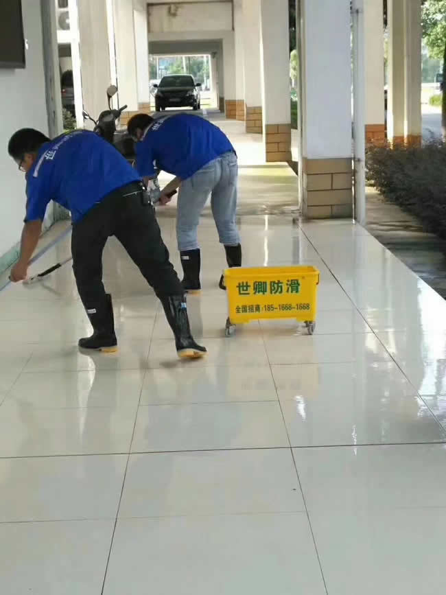 世卿防滑【蕪湖代理】安徽蕪湖縣南湖學校地面防滑處理現場施工中,校方領導現場測試對防滑效果非常滿意。