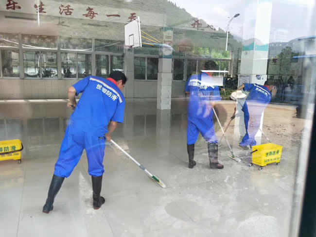 世卿防滑—朝天第一小學校13年第一次嘗試地面瓷磚防滑處理,時隔六年再次對食堂所有地面瓷磚進行二次防滑處理,且六年內無一例因地面濕滑而造成的摔傷事故。