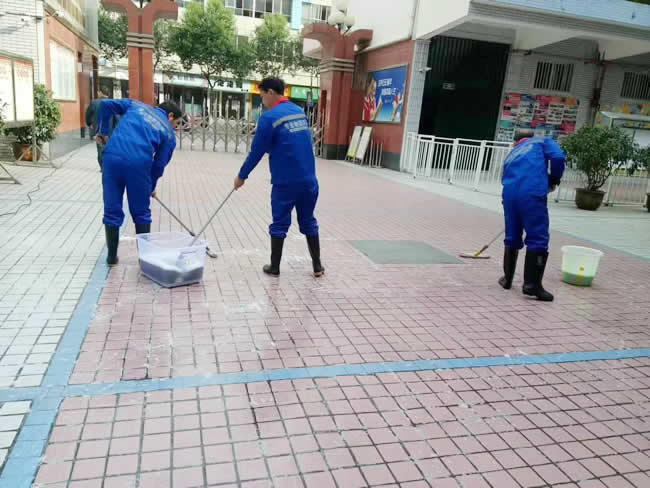4月15日廣元南鷹小學校教工食堂、廚房及部份廣場地面防滑處理施工。成本比草坪低,使用壽命是草坪的兩三倍,易清潔且防滑效果最佳。不信免費做樣試試。