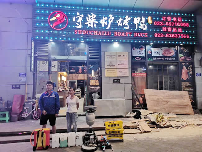 世卿成都分公司-重慶團隊,2019-8-19,重慶市重慶大學城【守柴爐烤鴨】餐廳地面防滑施工完畢!謝謝餐廳劉總信任與支持!