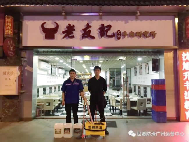 2018年11月27日廣州世卿小分隊為了不影響客戶正常營業,凌晨2點對廣州市老友記火鍋-牛肉研究所餐廳店面地面過道處理,店鋪為了提高客戶安全系數,對過道做地面防滑處理,效果四星標準,為世卿伙伴點贊,做防滑我們是專業的!