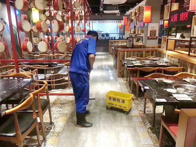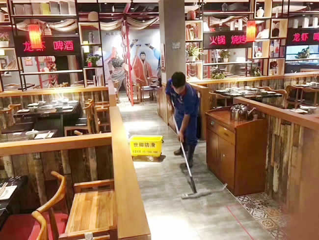 上海浦江鎮江文路蜀中大匠餐廳地面防滑處理于6-26日凌晨處理完工,老板新店營業關注行走安全,防止意外滑倒。