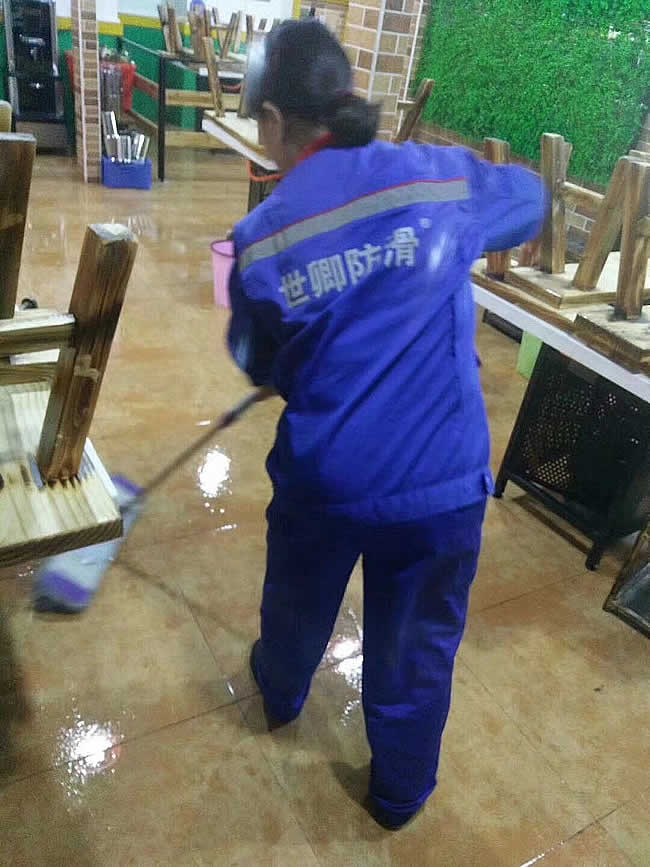 東莞小郡肝串串店地面防滑處理,老板怒贊效果好,懸著的心終于放下了,再也不用擔心顧客滑倒摔傷意外發生。