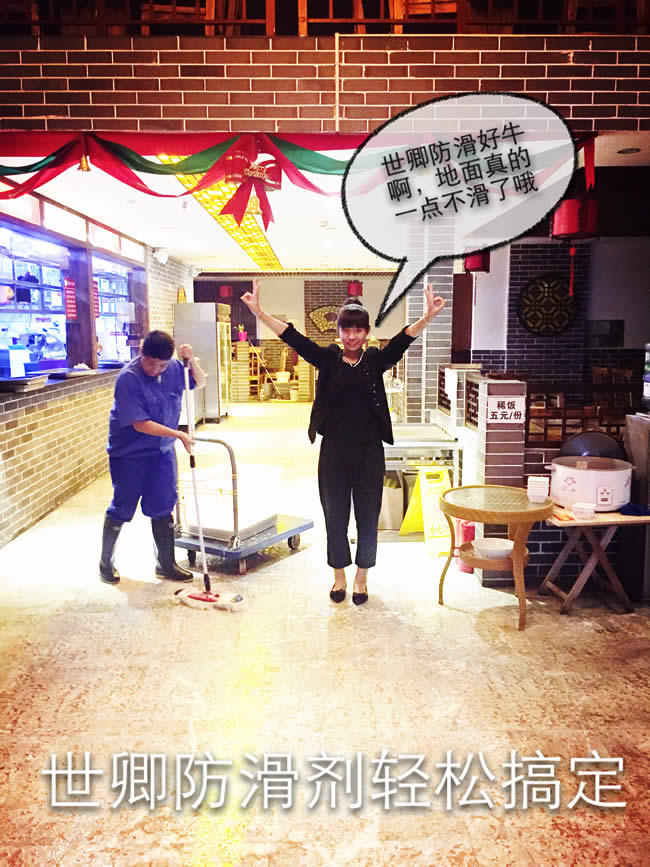 祝賀世卿防滑防護科技有限公司于2015年8月完成昆明潮麻火鍋連鎖的地面防滑施工工程。 上海世卿防滑防護科技有限公司專業研發,生產,銷售地面防滑材料,并承接大面積防滑工程,專業施工團隊,為您上門服務!我們堅持秉承創造綠色環保、營造安全健康,創新發展、不斷超越的經營理念以及客戶至上的核心價值觀,一直在努力做對社會有意義的事! 昆明潮麻火鍋,地面濕滑一直困擾著經營者,做過地面打磨、鋪防滑墊等措施都無濟于事,最后上海世卿地面防滑的專業人員上門完美解決。