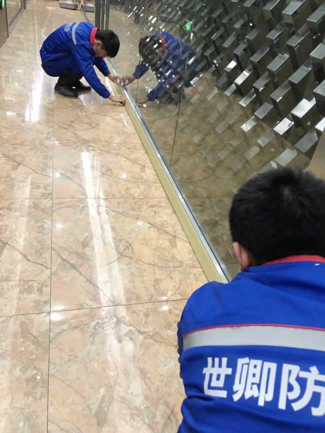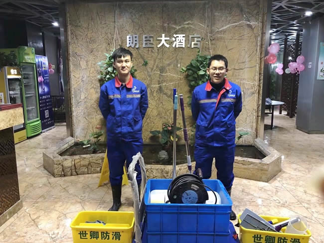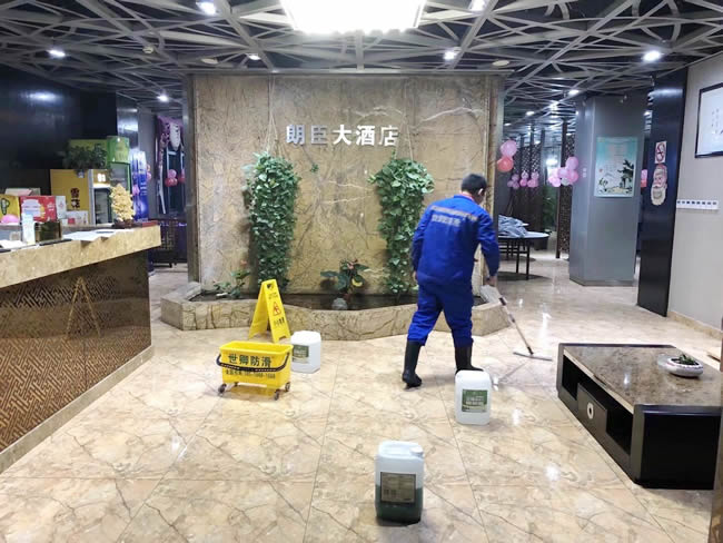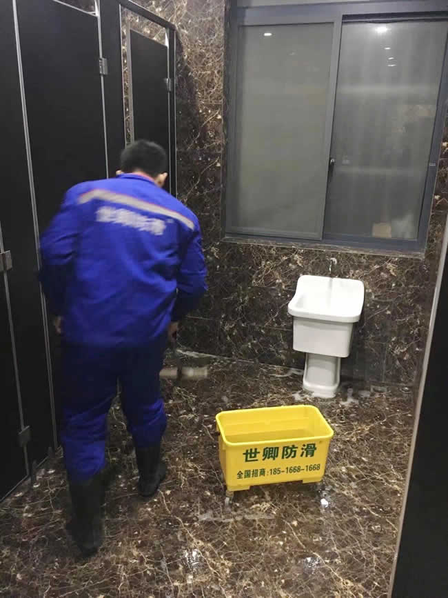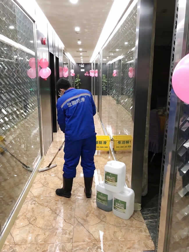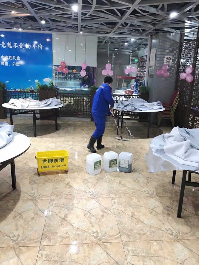 世卿防滑精益求精,未施工先保護。上海市嘉定區朗臣大酒店于2018年1月7日夜地面防滑處理完工。