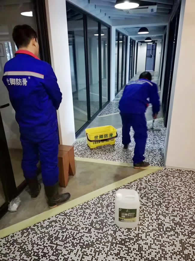 未施工先保護,世卿防滑精工出細活!上海市茅臺路567號,上服集團辦公大樓馬賽克瓷片地面防滑處理于2018年1月6日完工,做防滑,首選世卿!
