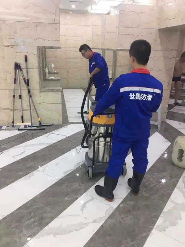 吉林四平威尼斯池典洗浴中心2017.11.10日地面防滑施工完畢。新店剛剛開業(yè)不到一個月,老板一直為地面濕滑問題發(fā)愁,地面鋪了防滑膠墊也不管用,還影響美觀,直到遇到世卿防滑,完美的解決了地面濕滑問題。